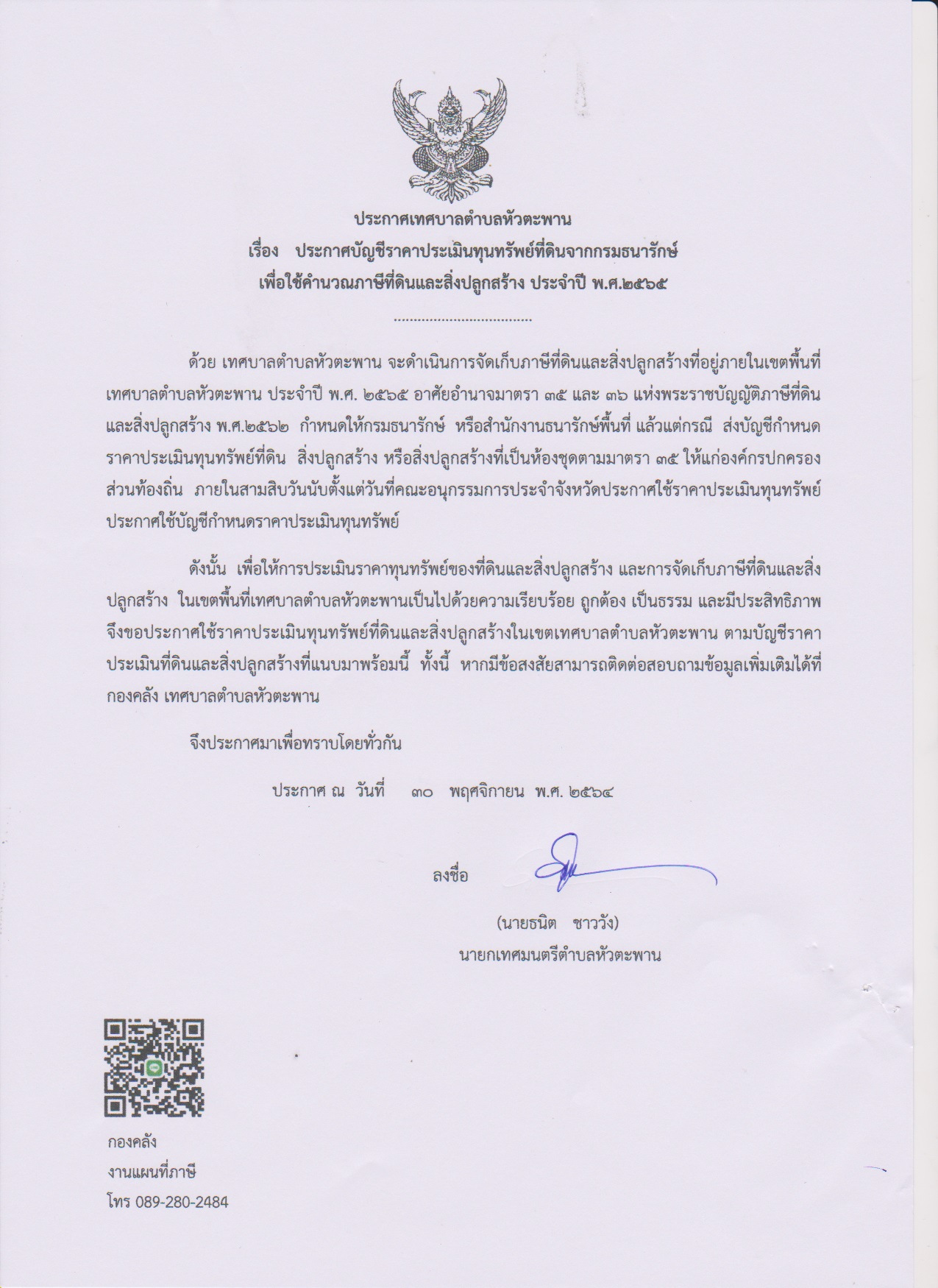 หัวข้อ :: ประกาศราคาประเมินทรัพย์สินเพื่อใช้จัดเก็บภาษีที่ดินและสิ่งปลูกสร้างประจำปี พ.ศ.2565