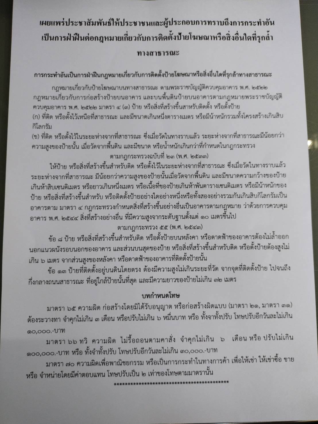 หัวข้อ :: เผยแพร่ประชาสัมพันธ์ให้ประชาชนและผู้ประกอบการทราบถึงการกระทำอันเป็นการฝ่าฝืนต่อกฎหมายเกี่ยวกับการติดตั้งป้ายโฆษณาหรือสิ่งอื่นใดที่รุกล้ำทางสาธารณะ