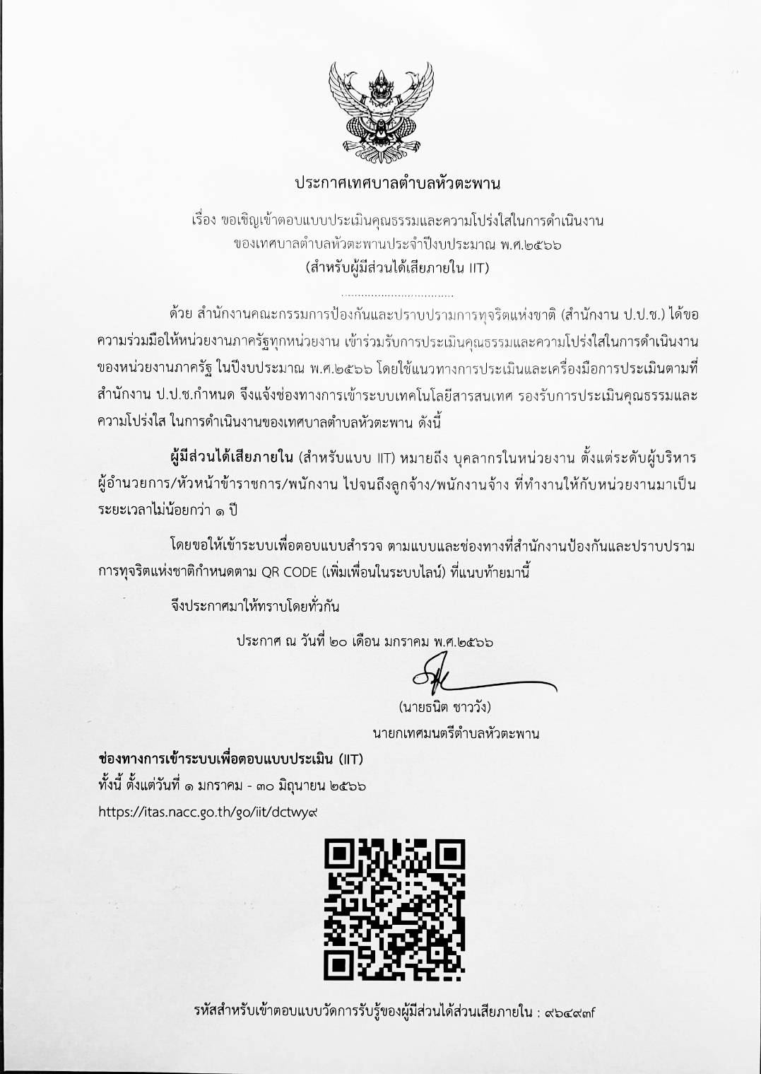 ประกาศเทศบาลตำบลเทศบาลตำบลหัวตะพาน เรื่อง ขอเชิญเข้าตอบแบบประเมินคุณธรรมและความโปร่งใสในการดำเนินงานฯ ประจำปีงบประมาณ พ.ศ.2566 (สำหรับผู้มีส่วนได้เสียภายใน IIT)