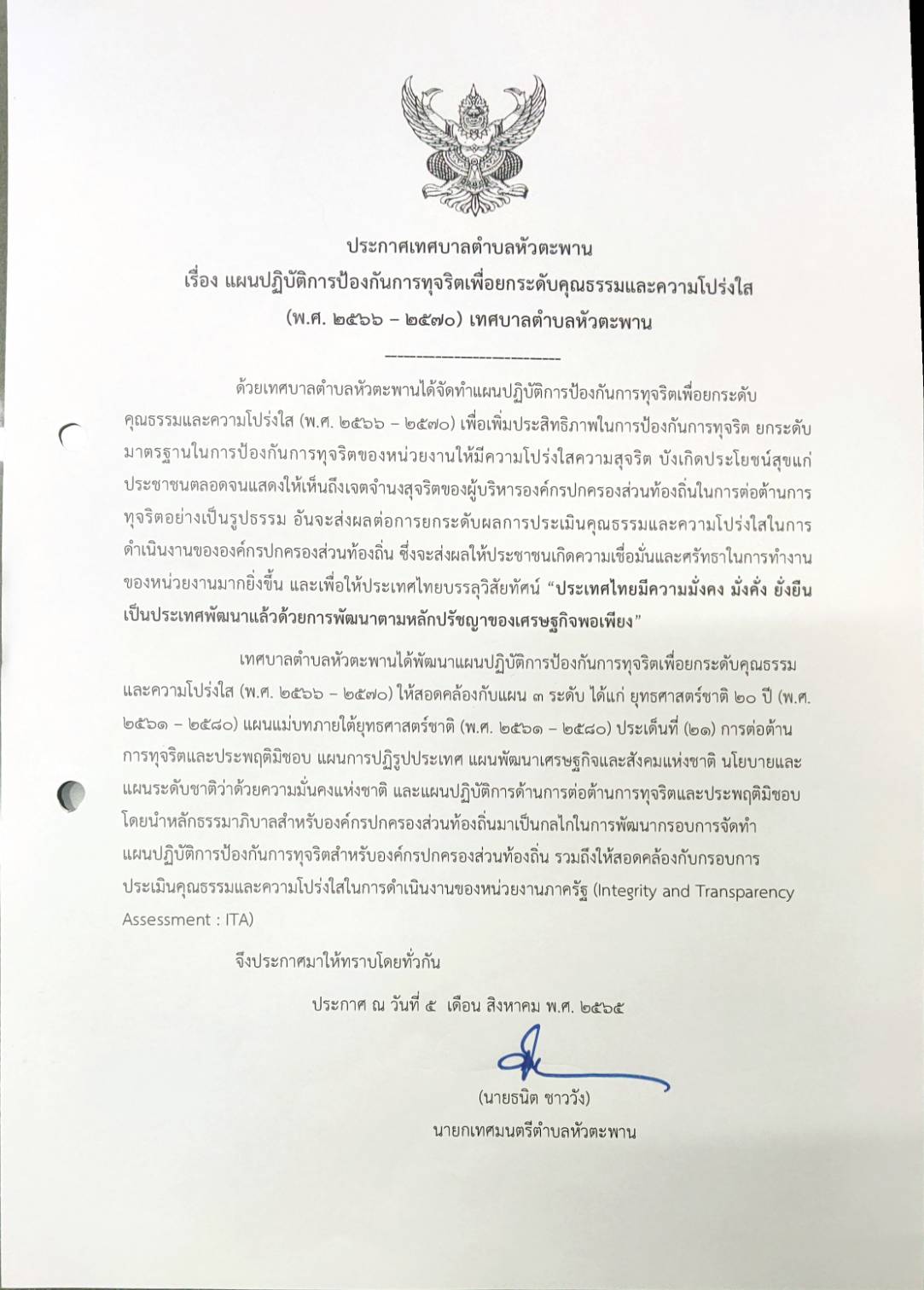 หัวข้อ :: ประกาศเทศบาลตำบลหัวตะพาน เรื่องแผนปฏิบัติการป้องกันการทุจริตฯ