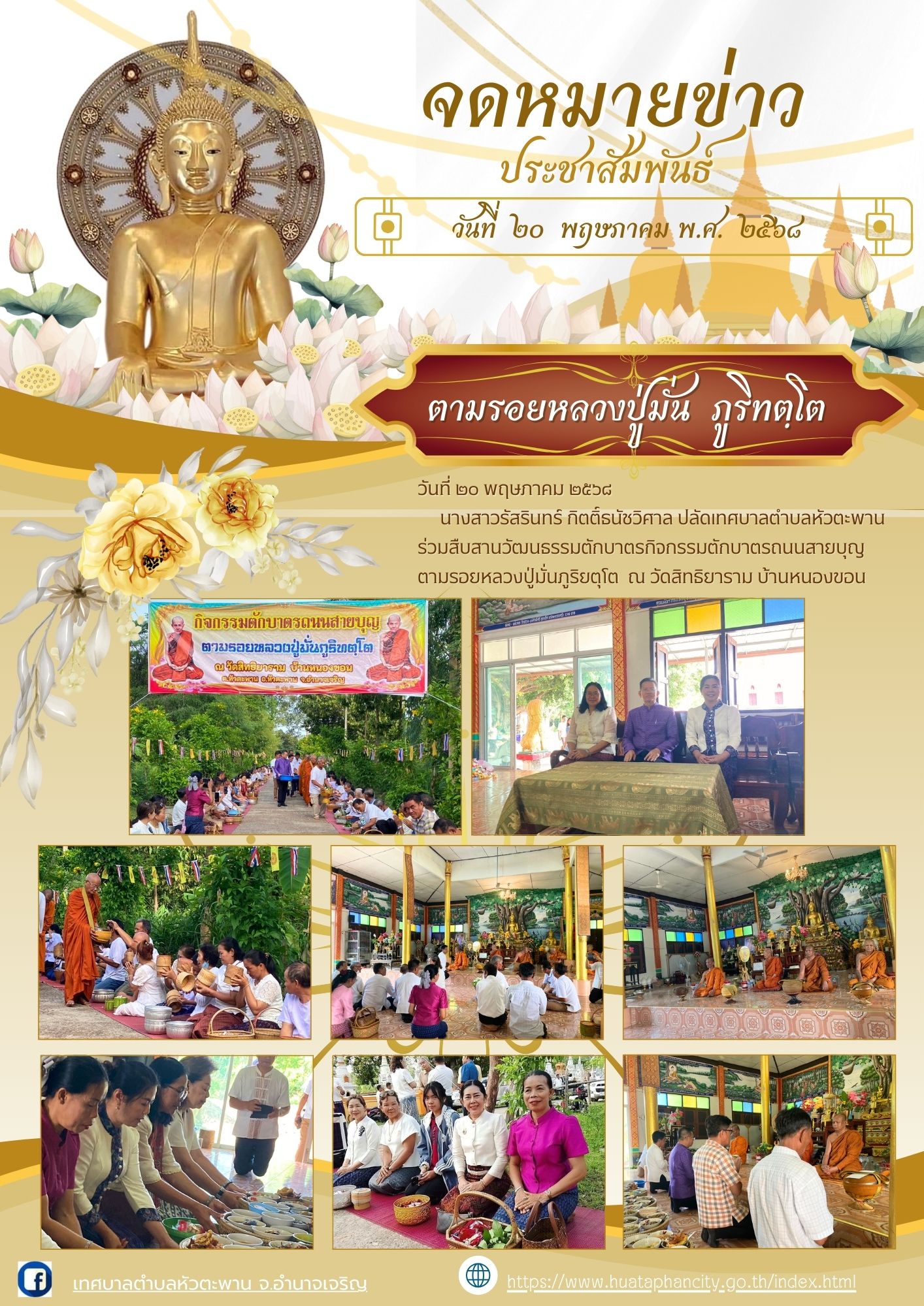 นางสาวรัสรินทร์ กิตติ์ธนัชวิศาล ปลัดเทศบาลตำบลหัวตะพาน ร่วมกิจกรรมสืบสานวัฒนธรรมตักบาตรกิจกรรมตักบาตรถนนสายบุญ ตามรอยหลวงปู่มั่นภูริยตุโต ณ วัดสิทธิยาราม บ้านหนองขอน