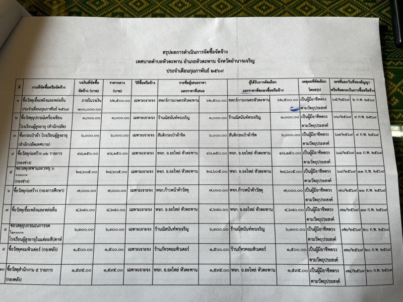 สรุปผลการจัดจัดซื้อจัดจ้างเทศบาลตำบลหัวตะพาน ประจำเดือนกุมภาพันธ์ 2569